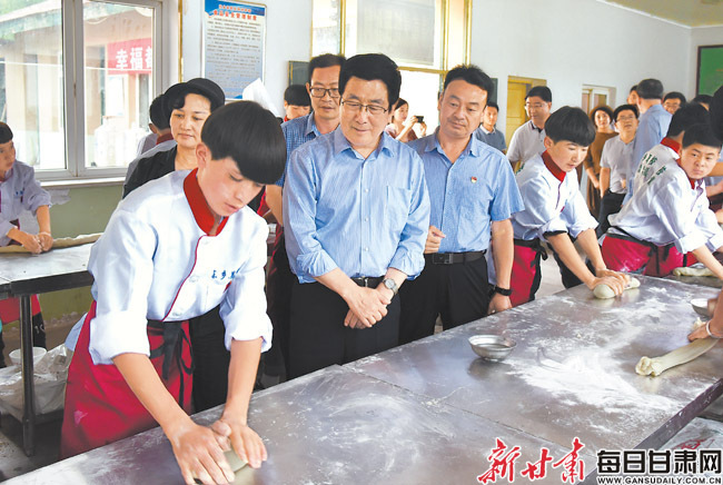東鄉(xiāng)縣職業(yè)技術(shù)學(xué)校里,學(xué)生們正在接受特色美食培訓(xùn)。林鐸來到學(xué)生中間,了解他們的學(xué)習(xí)生活情況,勉勵(lì)大家學(xué)好手藝,掌握一技之長(zhǎng)。他說,東鄉(xiāng)縣發(fā)展餐飲業(yè)有傳統(tǒng)、有基礎(chǔ),市場(chǎng)潛力大,要尊重農(nóng)民群眾意愿,因人施教、因材施教,做好技能培訓(xùn)與市場(chǎng)和勞務(wù)公司的對(duì)接,拓寬貧困群眾增收渠道。