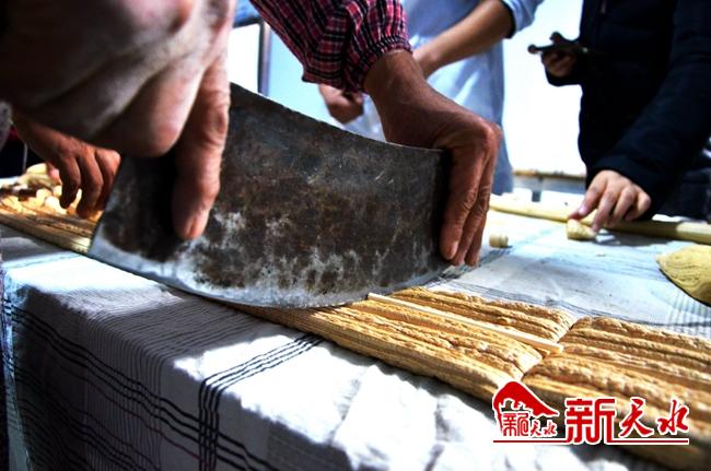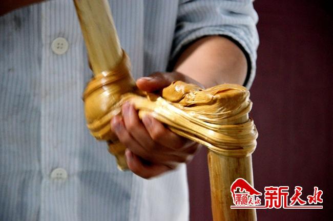 雖說(shuō)田新義已是師傅,許多工序業(yè)已不需他親自動(dòng)手,但重要環(huán)節(jié)的把控卻非他莫屬。待盆中的糖稀稍加冷卻后,田新義便用手將濃稠的熱糖從盆里捧出,挽于鍋邊架著的木樁上。借助鍋中冒出的熱氣,他和徒弟趁勢(shì)快速抻拔、折疊,通過(guò)反復(fù)的抻拔,使糖塊變成數(shù)米長(zhǎng)條。糖在空中若游龍翻滾、盤旋,繞成圈,又纏回木樁。糖色亦漸由深變淺,拉成千絲萬(wàn)縷,拉成米黃色澤。