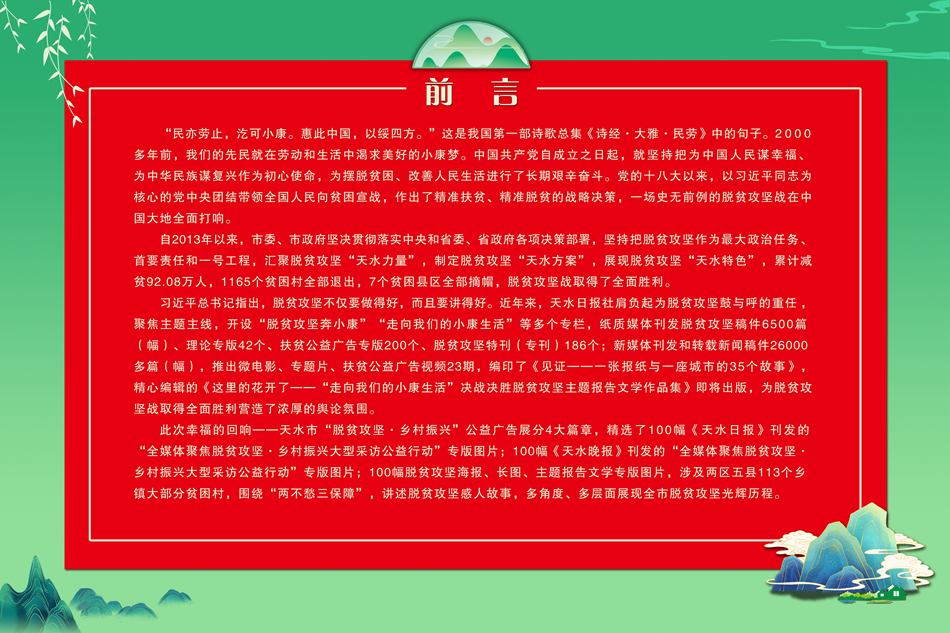 此次幸福的回響——天水市“脫貧攻堅·鄉(xiāng)村振興”公益廣告展分4大篇章,精選了100幅《天水日報》刊發(fā)的 “全媒體聚焦脫貧攻堅·鄉(xiāng)村振興大型采訪公益行動”專版圖片;100幅《天水晚報》刊發(fā)的“全媒體聚焦脫貧攻堅·鄉(xiāng)村振興大型采訪公益行動”專版圖片;100幅脫貧攻堅海報、長圖、主題報告文學專版圖片,涉及兩區(qū)五縣113個鄉(xiāng)鎮(zhèn)大部分貧困村,圍繞“兩不愁三保障”,講述脫貧攻堅感人故事,多角度、多層面展現(xiàn)全市脫貧攻堅光輝歷程。