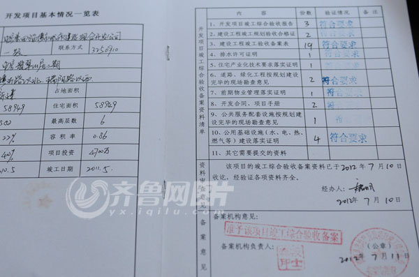 ????《淄博市房地產(chǎn)開發(fā)項目竣工綜合驗收備案表》顯示,該項目的竣工綜合驗收備案資料已于2012年7月10日收訖,經(jīng)驗證各項資料齊全。