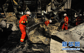 ??? 6月3日,消防官兵在火災現場進行搜救。當日,吉林省德惠市米沙子鎮(zhèn)寶源豐禽業(yè)有限公司發(fā)生火災。新華社記者 王昊飛 攝