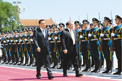 ????7月5日,國務(wù)院總理李克強在北京人民大會堂同巴基斯坦總理謝里夫舉行會談。會談前,李克強在人民大會堂東門外廣場為謝里夫舉行歡迎儀式。新華社記者 張 鐸攝