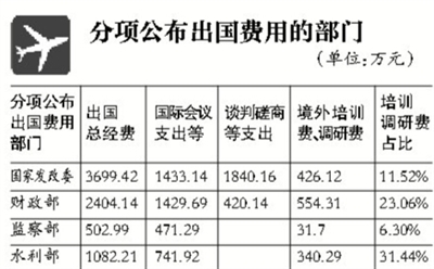 ????今年,針對“三公”經(jīng)費中的出國經(jīng)費決算,國家發(fā)改委、財政部、監(jiān)察部、商務(wù)部、水利部等首次分類公布詳細(xì)數(shù)額。出國經(jīng)費從名目上主要分為國際會議、磋商談判、境外培訓(xùn)、調(diào)研費幾大類。其中,出國經(jīng)費公布程度較高的幾個部門,首次單列出了這幾個名目的花費。