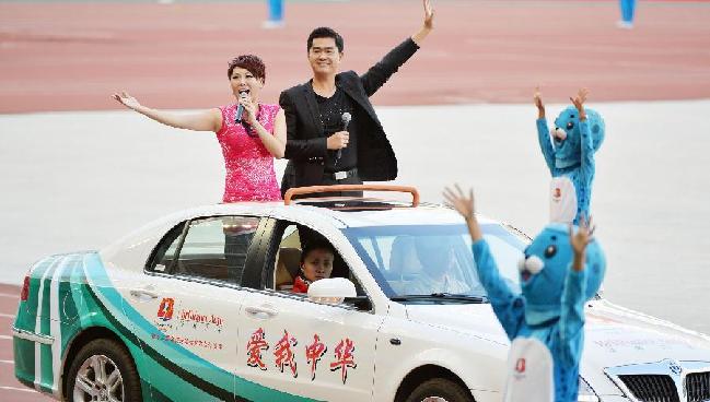 8月31日,第十二屆全國運動會在遼寧沈陽開幕。這是演員吳曉丹、孫大為在開幕式前演唱全運歌曲。 新華社記者陳曄華攝