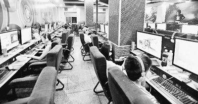 圖為天津市河西區(qū)衛(wèi)星里居民區(qū)里某網(wǎng)吧。很多青少年在上網(wǎng),他們有的在打游戲,有的在看電影,身邊的桌子上放著方便面、飲料、香煙等。李世琦攝