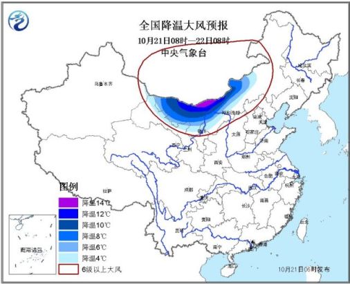 21日起,受冷空氣影響,內(nèi)蒙古大部、華北、黃淮、東北等地有4~8℃降溫,部分地區(qū)降溫可達8~10℃,上述地區(qū)并伴有4~6級偏北風(fēng)。22~23日,內(nèi)蒙古東北部有小到中雪(雨),局部大雪。