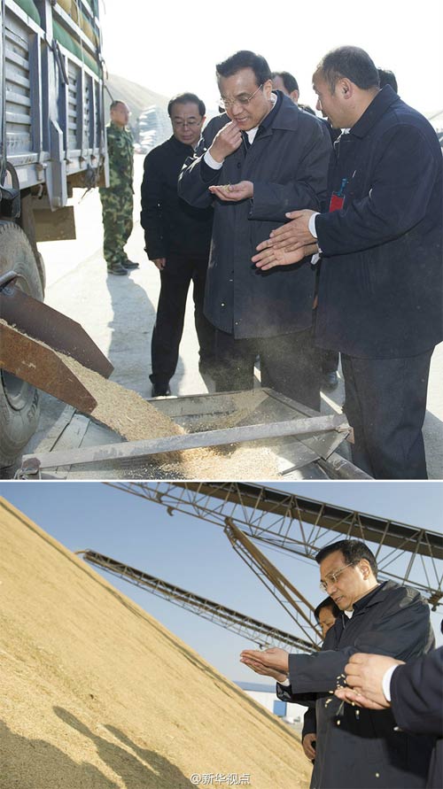 ????黑龍江是我國(guó)重要的商品糧基地,李克強(qiáng)來(lái)到以股份制方式建設(shè)和經(jīng)營(yíng)的撫遠(yuǎn)濃橋糧庫(kù),考察秋糧收儲(chǔ)工作。他抓起烘干塔傳送帶上的稻谷仔細(xì)查看,并放入嘴中咀嚼,感受水分和品質(zhì)。他還登上高高的谷堆,查看庫(kù)里的存糧。李克強(qiáng)說(shuō),人是鐵,飯是鋼,大米是金,站在這個(gè)金倉(cāng)上,我們心里就踏實(shí)。他要求,要切實(shí)做好秋糧收購(gòu)工作。并強(qiáng)調(diào),現(xiàn)代農(nóng)業(yè)要由現(xiàn)代農(nóng)產(chǎn)品物流網(wǎng)絡(luò)作支撐。要?jiǎng)?chuàng)新機(jī)制,探索中央、地方和社會(huì)多方參與的收儲(chǔ)、流通模式,以更好地調(diào)控市場(chǎng)、穩(wěn)定價(jià)格,保障糧食安全,滿足人民群眾多樣化需求。