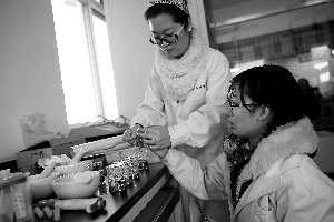 北京農(nóng)學(xué)院的檢測(cè)人員將需要檢測(cè)的菜品分裝到玻璃瓶中,以便在不同時(shí)間段檢測(cè)菜品中亞硝酸鹽的含量。記者 吳鏑攝
