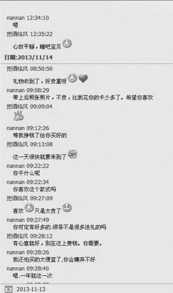 另11月14日的聊天記錄則顯示,“nannan”送了一條領(lǐng)帶給男方,“把酒臨風(fēng)”覺得貴重,“nannan”則說:“不貴,比我花你的卡少多了。”之后,“把酒臨風(fēng)”戴上領(lǐng)帶照了一張照片發(fā)給對方。