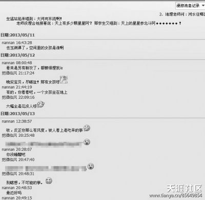 5月13日的聊天記錄中,“把酒臨風(fēng)”對“nannan”說,“我們互相關(guān)心著,溫暖著,彼此增長著正能量,感覺身子也是連在一起的”。9月1日的聊天記錄顯示,“把酒臨風(fēng)”稱自己要在黨校學(xué)習(xí)一段時間,11月初結(jié)束。同時,“把酒臨風(fēng)”還表示過教室屏蔽信號,無法及時與對方聯(lián)系。