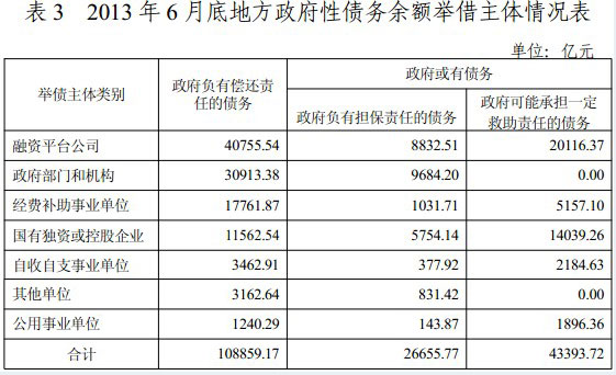 ????——從舉借主體看,融資平臺公司、政府部門和機(jī)構(gòu)、經(jīng)費補(bǔ)助事業(yè)單位是政府負(fù)有償還責(zé)任債務(wù)的主要舉借主體,分別舉借40755.54億元、30913.38億元、17761.87億元(詳見表3)。