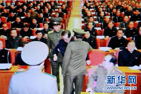 ???? 這張翻拍自朝鮮中央電視臺(tái)的電視畫面顯示,張成澤在12月8日勞動(dòng)黨中央政治局?jǐn)U大會(huì)議現(xiàn)場(chǎng)被帶走。 新華社記者張利攝