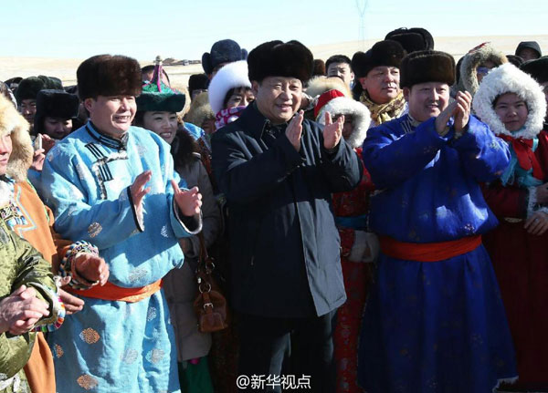 ????習近平還來到寶力根蘇木牧民瑪吉格家,客廳、廚房、臥室、庫房,一一察看。81歲的老人說,30多年前只有一頂破蒙古包、一輛勒勒車、一只狗,現(xiàn)在全家年純收入10萬,日子不錯。習近平說,你講得真好,要把發(fā)展變化講給子孫聽。臨別時他用蒙語“巴雅爾太”同大家說再見。