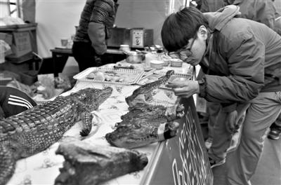 ????北京龍?zhí)稄R會,來自吉林的王成全以4萬元租價租下龍?zhí)稄R會一個攤位賣烤鱷魚肉,攤位前吸引不少年輕人駐足。本版攝影/新京報記者 王叔坤