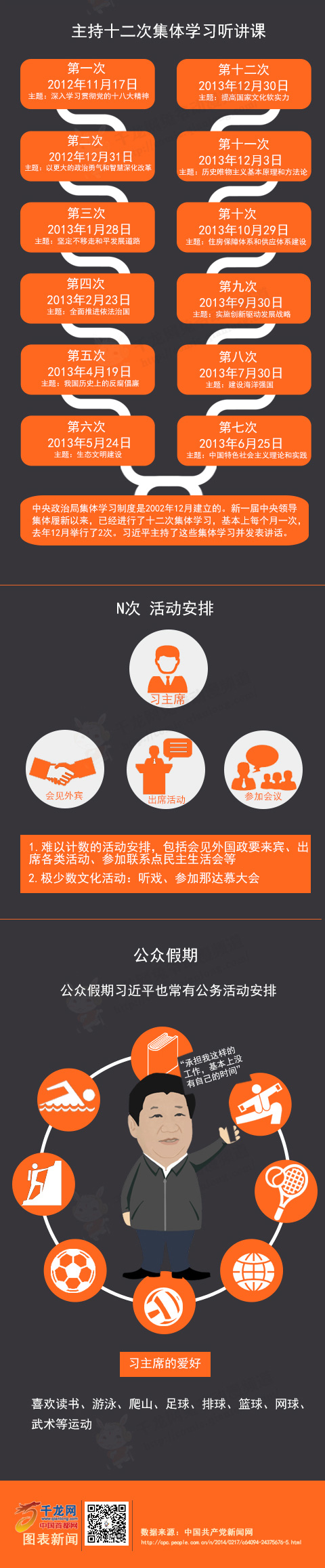 ??? “我個(gè)人的時(shí)間都去哪兒了?當(dāng)然是都被工作占去了?!苯衲?月初,習(xí)近平在俄羅斯索契接受俄羅斯媒體專訪時(shí)說(shuō)。根據(jù)官方媒體公開(kāi)報(bào)道所不完全統(tǒng)計(jì),自中共十八大至今的近15個(gè)月里,習(xí)近平國(guó)內(nèi)考察調(diào)研、出訪、參加各類會(huì)議共80余次,足跡遍及國(guó)內(nèi)三分之一的省份和世界五大洲。