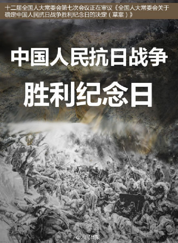 ????十二屆全國人大常委會第七次會議25日下午審議全國人大常委會關(guān)于確定中國人民抗日戰(zhàn)爭勝利紀念日的決定草案和全國人大常委會關(guān)于設(shè)立南京大屠殺死難者國家公祭日的決定草案。