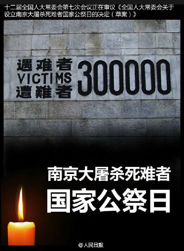 ????關(guān)于設(shè)立南京大屠殺死難者國家公祭日的決定草案的說明指出,1937年12月13日,侵華日軍在中國南京開始對我同胞實施長達四十多天慘絕人寰的大屠殺,三十多萬人慘遭殺戮,制造了震驚中外的南京大屠殺慘案。這一公然違反國際法的殘暴行徑,鐵證如山,經(jīng)第二次世界大戰(zhàn)后設(shè)立的遠東國際軍事法庭和南京審判戰(zhàn)犯軍事法庭審判,早有歷史結(jié)論和法律定論。設(shè)立南京大屠殺死難者國家公祭日,在國家層面舉行公祭活動和相關(guān)紀念活動,是十分必要的。