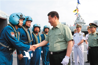 ????2013年4月,習(xí)近平視察海軍駐三亞部隊(duì),在井岡山艦上與艦載直升機(jī)飛行員親切握手。 新華社發(fā)