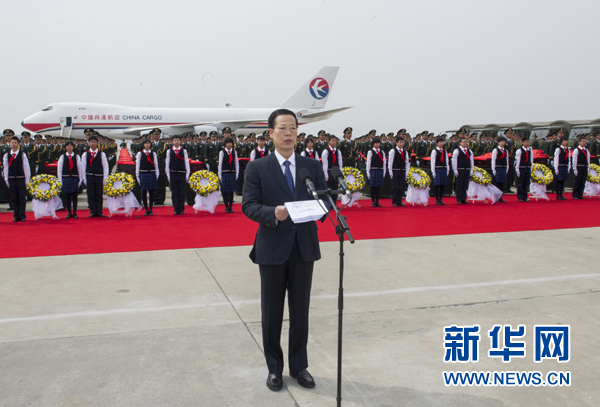 ??? 新華網(wǎng)沈陽(yáng)3月28日電(記者張旭東、徐揚(yáng))中共中央政治局常委、國(guó)務(wù)院副總理張高麗28日上午在沈陽(yáng)桃仙國(guó)際機(jī)場(chǎng)出席在韓中國(guó)人民志愿軍烈士遺骸回國(guó)迎接儀式并講話。上午6:30,中韓雙方在韓國(guó)仁川國(guó)際機(jī)場(chǎng)舉行437位在韓志愿軍烈士遺骸交接儀式。運(yùn)送烈士遺骸的專機(jī)進(jìn)入中國(guó)領(lǐng)空后,空軍兩架戰(zhàn)斗機(jī)迎接護(hù)航。11:30迎接儀式在沈陽(yáng)桃仙國(guó)際機(jī)場(chǎng)正式開(kāi)始。