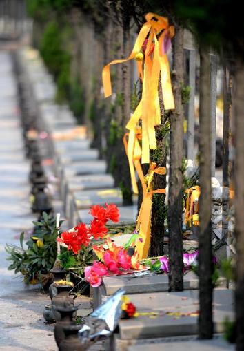????一些陵園的氛圍也在發(fā)生變化。中國人在清明時節(jié)掃墓,入眼的色彩漸漸豐富,不再是灰色的煙灰、灰色的墓碑、褐色的土地,而是點綴上令人愉悅的黃絲帶、幸運風(fēng)車或是千紙鶴。