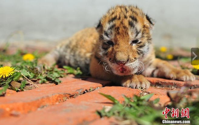 ????4月6日,沈陽怪坡東北虎園,一只剛出生10天的小東北虎,在地上漫爬,天真賣萌的表情惹人喜愛,這是今年虎園生下的首只東北虎。中新社發(fā) 于海洋 攝