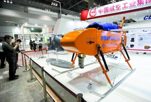 ????中國(guó)航空工業(yè)集團(tuán)的展區(qū)擺放了20多架飛機(jī)和飛機(jī)模型,其中有近10架無(wú)人機(jī)。
