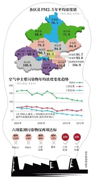 ????繼今年年初北京發(fā)布首個(gè)PM2.5年均濃度值,4月10日北京發(fā)布《2013年北京市環(huán)境狀況公報(bào)》(以下簡稱《公報(bào)》)。該公報(bào)首次納入PM2.5等6項(xiàng)污染物,并首次曬出各區(qū)縣PM2.5年均值,其中大興、房山和通州的PM2.5最高。去年北京PM2.5年均濃度為89.5微克/立方米,比“國標(biāo)”35微克/立方米超標(biāo)156%。