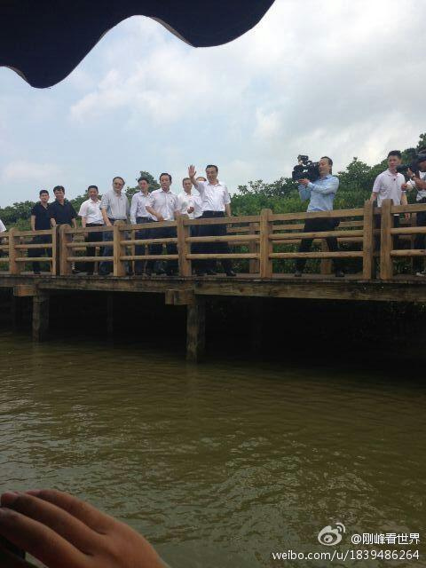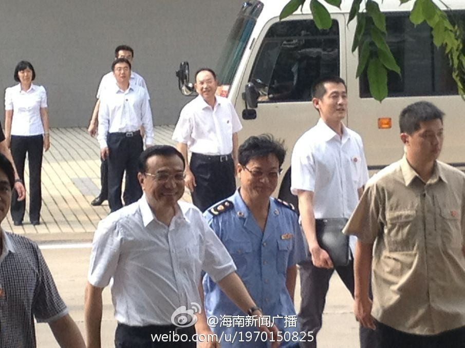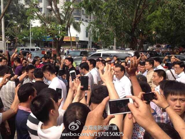 國務(wù)院總理李克強到海南省??谑姓{(diào)研,總理先到??诠ど叹忠暡旃ぷ鳎髞淼轿挥诤?诠ど叹指浇纳啼?,和當?shù)厝罕娀印#▓D自@海南新聞廣播)