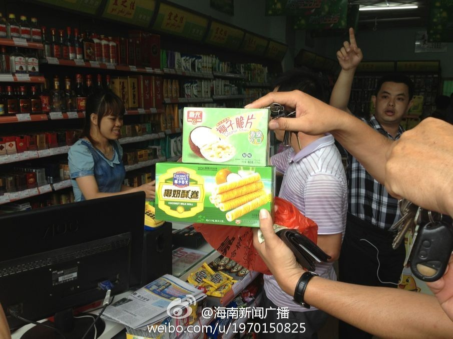 李克強總理在這家名為“宜之佳”的便利店,掏錢購買了一盒椰子脆片和一盒椰奶酥卷,共計19元。(圖自@海南新聞廣播)