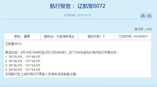 ????中新網(wǎng)4月16日電:據(jù)遼寧海事局網(wǎng)站消息,16日19時(shí)至17日8時(shí),在黃海北部相關(guān)水域?qū)?zhí)行軍事任務(wù),要求期間任何船只不得進(jìn)入該海域。