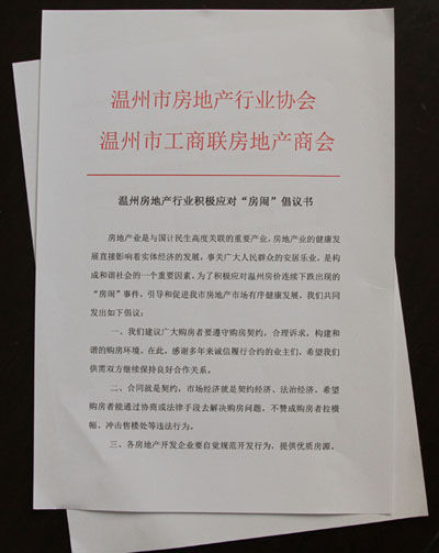 ????原標題:溫州房地產(chǎn)商發(fā)聯(lián)合倡議書應對“房鬧”