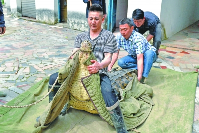 馴鱷師騎上鱷魚背將其制服。記者喻志勇 攝