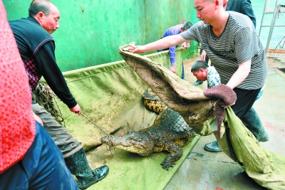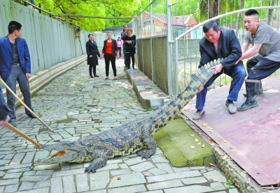 ????4月14日上午,漢口中山公園鱷魚園內(nèi),馴鱷師將溫室里冬眠的22條鱷魚轉(zhuǎn)場,用套脖子、捆嘴巴、蒙眼睛、抬擔架等方法,忙了2個多小時才將它們一一送進室外觀賞園。這批鱷魚去年10月中旬起冬眠了半年。這些鱷魚全是尼羅鱷,最重的有500多斤。