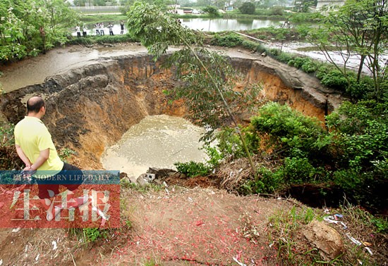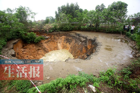 ????記者從村民那里了解到,韋清華的魚塘出現(xiàn)塌陷后,賓陽縣國土資源局及賓州鎮(zhèn)政府等相關(guān)部門和單位先后到現(xiàn)場查看。19日下午,賓陽縣國土資源局礦政股股長楊曉燕介紹,經(jīng)過實地勘查,發(fā)現(xiàn)災(zāi)害點屬地面塌陷,處于不穩(wěn)定狀態(tài),無人員傷亡。19日上午,南寧市國土資源局和南寧市地質(zhì)環(huán)境監(jiān)測站也派專家組到現(xiàn)場調(diào)查,初步鑒定為溶巖地面塌陷,長約10米,寬約13米,可見深度約6米,坑內(nèi)沒有發(fā)現(xiàn)基巖。