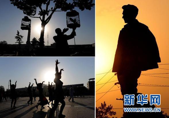????拼版照片:左上為蘭考縣城一個(gè)公園里晨練者在遛鳥(5月5日攝);左下為蘭考縣城晨練者在跳廣場舞(5月5日攝);右為蘭考縣城一尊焦裕祿塑像(5月4日攝)。 新華社記者朱祥 攝