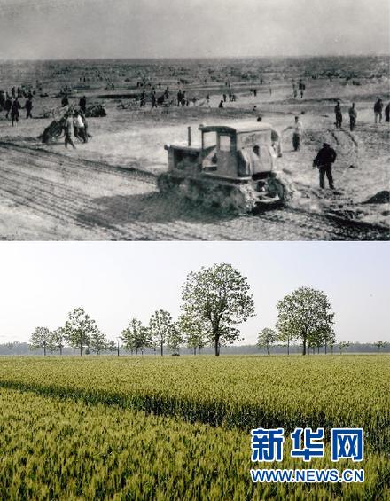 ????這組拼版照片顯示了二十世紀(jì)六十年代蘭考改造鹽堿地的情形(上圖,資料照片);下圖為5月5日拍攝的蘭考縣固陽鎮(zhèn)的一片麥田(新華社記者朱祥攝)。 新華社發(fā)