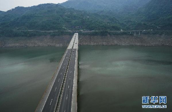 ????俯瞰紫平鋪水庫上的都汶高速大橋(5月6日攝)。