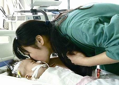 圖為:母親親吻病床上的小卓卓