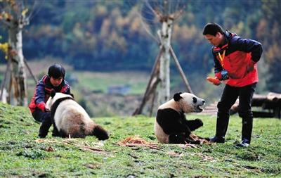 ????工作人員和熊貓幼崽交流。2012年10月30日,四川臥龍中國(guó)大熊貓保護(hù)研究中心舉行儀式,歡迎18只大熊貓從碧峰峽基地重返臥龍,這是汶川大地震后4年多來(lái),首批大熊貓返回臥龍的重建基地。中新社發(fā)