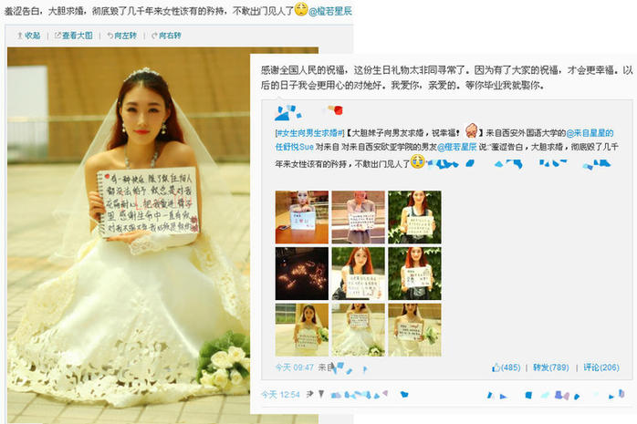 ????今天凌晨,西安外國(guó)語(yǔ)大學(xué)女生 @ 來(lái)自星星的任舒悅Sue 發(fā)微博向男友羞澀告白、大膽求婚。這一大膽行為得到了許多認(rèn)得祝福,其男友 @ 橙若星辰也在微博與其互動(dòng):“無(wú)論大家吐槽還是祝福,我們都一定會(huì)很幸福。感謝大家的祝福,這份生日禮物太非同尋常了。因?yàn)橛辛舜蠹业淖8?,才?huì)更幸福。以后的日子我會(huì)更用心的對(duì)她好。我愛(ài)你,親愛(ài)的。等你畢業(yè)我就娶你!”