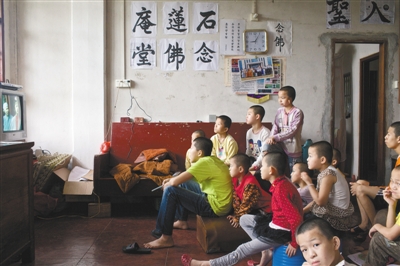 ????沒有零食、沒有游樂園,沒有電影,沒有父母的疼愛,陪伴這些孩子的只有經(jīng)書、佛像、收音機(jī)里24小時(shí)不間斷播放的佛樂,廟里的幾只大烏龜和夏天山里成群的蚊子。孩子們的童年就在這嚴(yán)格的清規(guī)生活中度過,除了年齡較大的孩子偶爾出門去給師父買藥和一些必用品,其他孩子幾乎很少與外界來往。