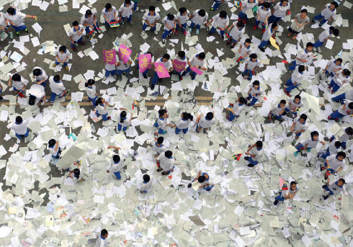 ???? 2014年6月4日,廣州市,廣州大學(xué)附屬中學(xué)高三、初三學(xué)生將廢棄試卷扔出教室,釋放壓力,迎接即將到來的考試。