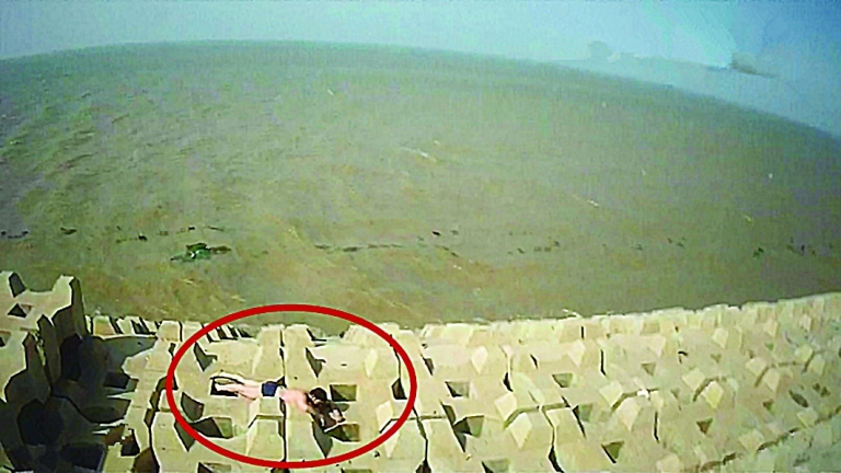 ????男子游到防波堤
