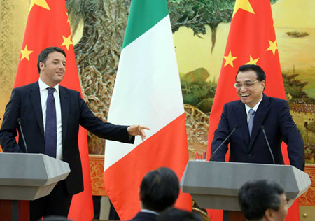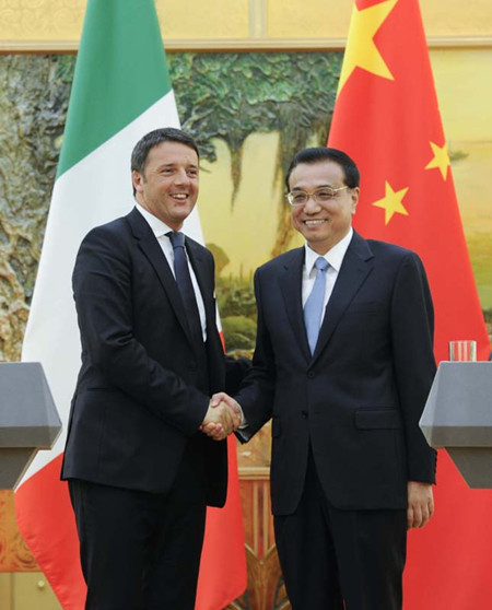 ????倫齊表示,意方積極評(píng)價(jià)意中全面戰(zhàn)略伙伴關(guān)系十年來(lái)的良好發(fā)展,愿同中方抓緊落實(shí)好雙方達(dá)成的共識(shí)及新的關(guān)于加強(qiáng)經(jīng)濟(jì)合作的三年計(jì)劃,深化并擴(kuò)大各領(lǐng)域合作,使意中關(guān)系走得更快更好。意方歡迎并期待李克強(qiáng)總理今年下半年訪意并出席亞歐首腦會(huì)議。倫齊還宣布將中國(guó)公民赴意簽證辦理時(shí)間縮短到36小時(shí)。
