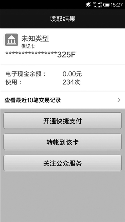 記者用小米3手機進行嘗試,將銀行卡放在手機背面,手機立即響起“嘟”的一聲提示音,隨后手機自動進入支付寶界面,并顯示出銀行卡的卡號、電子現(xiàn)金余額、銀行卡使用次數(shù),以及最近10筆交易記錄。隨后,記者又嘗試用該手機讀取他人的銀行卡,發(fā)現(xiàn)同樣可以顯示出以上信息,有時甚至還能顯示出身份證號首末2個數(shù)字,過程中都不用輸入密碼,但只能顯示不能交易。