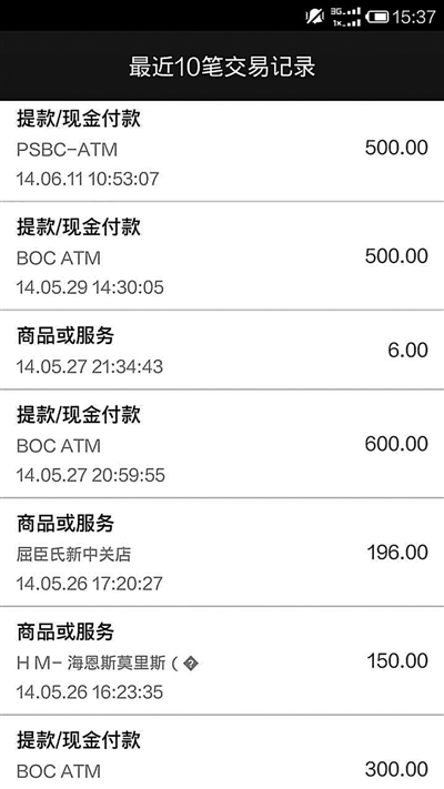 “2014年6月11日10時53分07秒提款/現(xiàn)金付款500元”“2014年5月26日17時20分27秒商品或服務196元”……把銀行卡放到手機背面輕輕一貼,不用輸入銀行卡密碼,手機竟讀出銀行卡號和最近10次交易記錄。