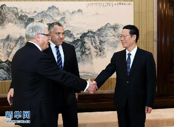 ????6月24日,國務(wù)院副總理張高麗在北京中南海紫光閣會(huì)見澳大利亞國庫部長霍基、貿(mào)易和投資部長羅布一行。 新華社記者 劉建生 攝