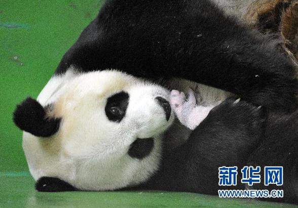 ????這是廣州長隆野生動物世界提供的大熊貓媽媽“菊笑”懷抱一只幼仔的照片(8月10日攝)。新華社發(fā)