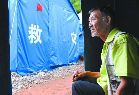 謝維禮老人在臨時安置點的帳篷內(nèi)向外張望(8月12日攝)。