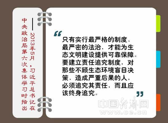 ????只有實行最嚴格的制度、最嚴密的法治,才能為生態(tài)文明建設(shè)提供可靠保障。要建立責(zé)任追究制度,對那些不顧生態(tài)環(huán)境盲目決策、造成嚴重后果的人,必須追究其責(zé)任,而且應(yīng)該終身追究?! ?